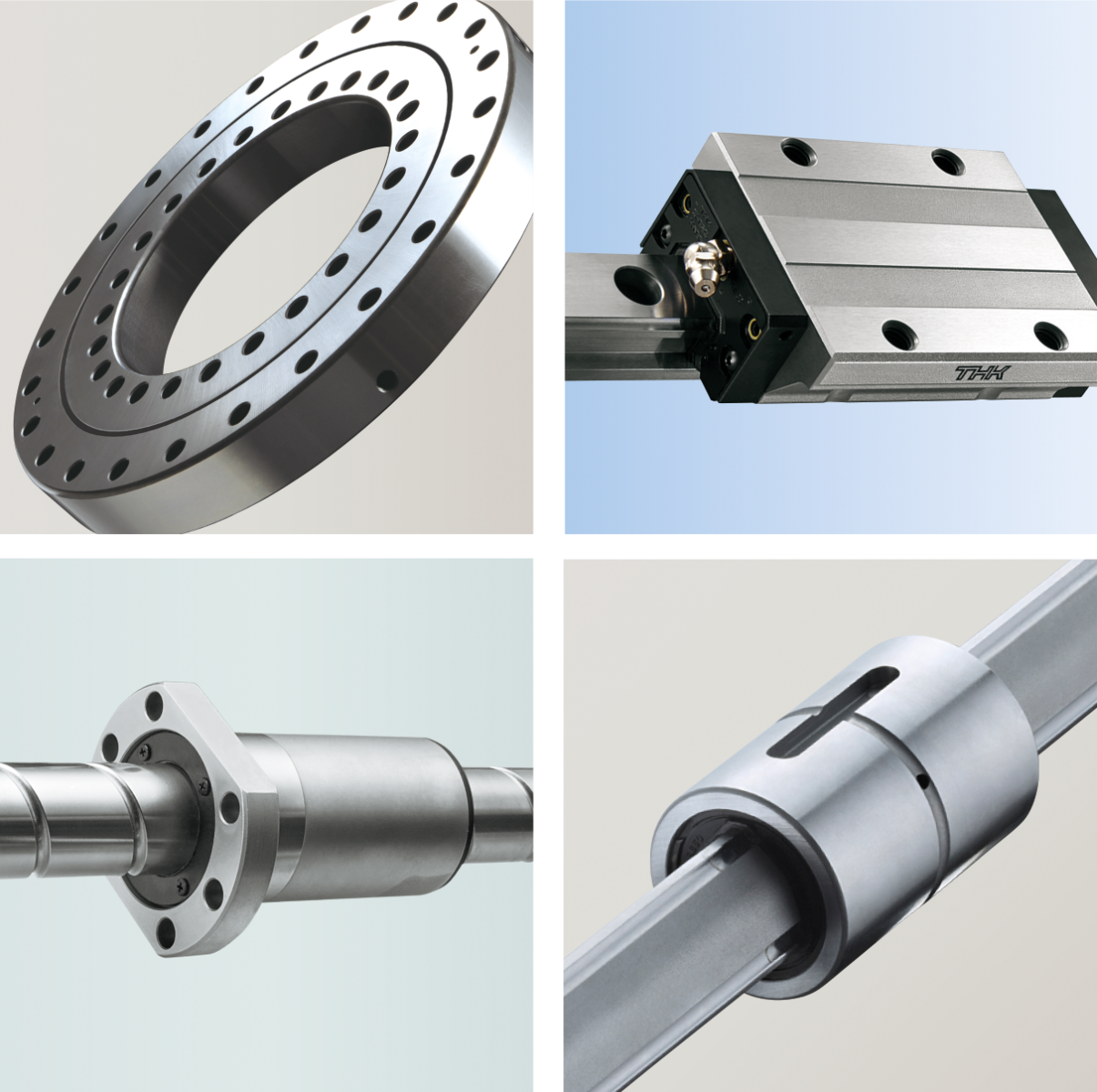 Illustration - THK products made from the special alloy THK-NM1 - THK offers the special alloy for almost its entire product range. These include linear guides (linear guideways), ball screws, ball splines and cross roller bearings.